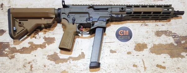 CM9 9mm AR Pistol or SBR – This is the flagship AR9 pistol of Chattahoochee Munitions. This will be one of the sturdiest-feeling weapons, as everything is designed in tight tolerances. All of our firearms are equipped with HIPERFIRE (High Performance Firearms) Triggers; all are 2.5lb single-stage Reflex (curved) or Competition (straight with shoe); Competition is pictured. Firearm takes standard Glock and clone mags.